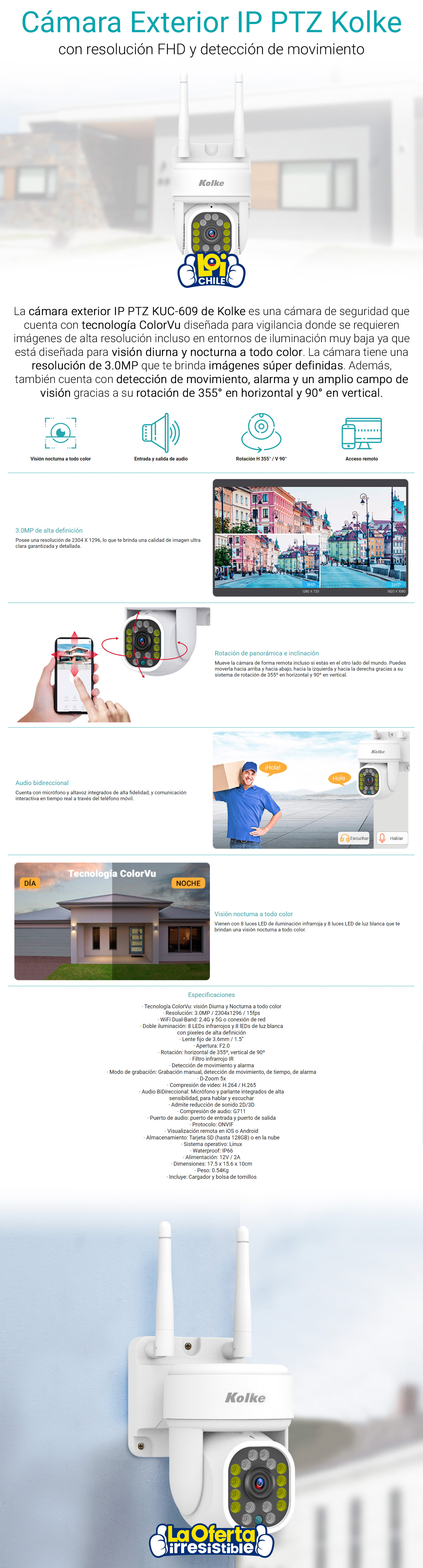 Camara de Seguridad Exterior Kolke IP PTZ FHD Color VU 3MP
