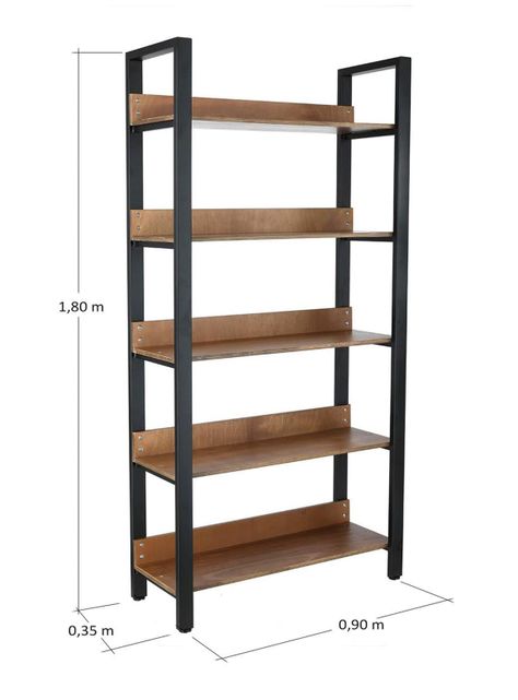 El estante cuenta con sólidos pilares de metal y 5 niveles de madera plywood barnizada