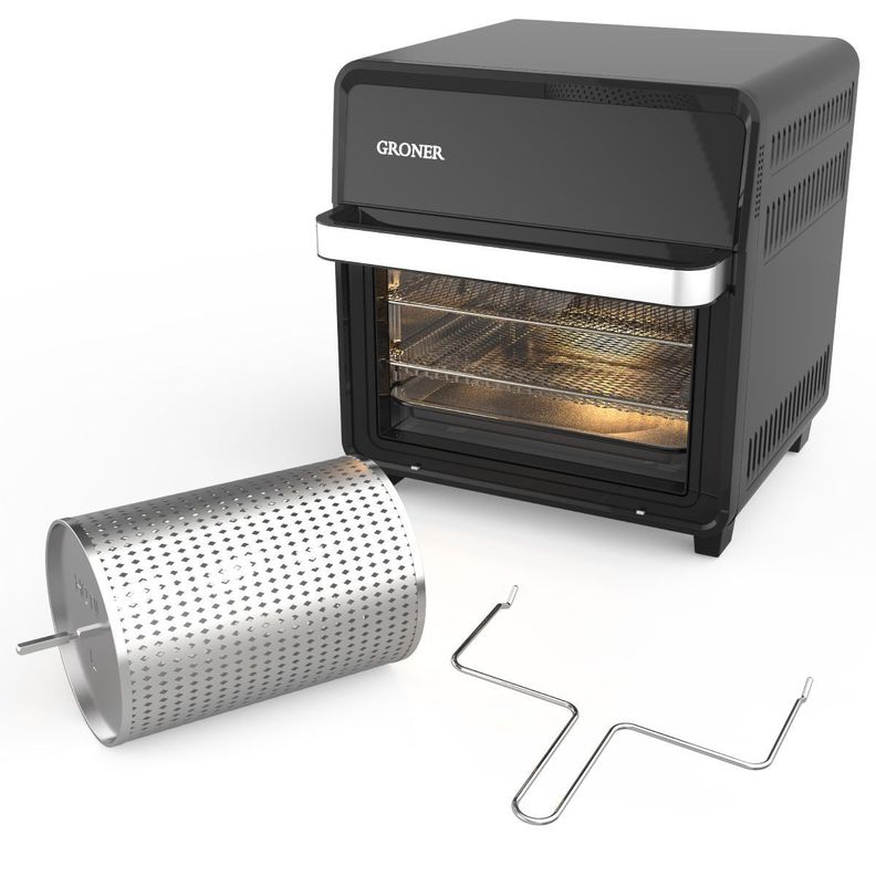 Horno Freidora de Aire Gröner 16L, la combinación perfecta para tu cocina. Su panel de control digital, capacidad de 16 litros y 10 programas automáticos, harán de este horno eléctrico tu preferido. Asar, deshidratar, hornear y sofreír son algunas de sus funciones que podrás realizar. Además, cuenta con sistema de aire caliente 360°, puerta con aislamiento térmico y ventana de doble protección que hará de tu cocción una más eficiente y homogénea. Incluye iluminación interior, protección contra sobrecalentamiento y diversos accesorios: canasto, 2 bandejas, brocheta de asador y herramienta de recuperación.
