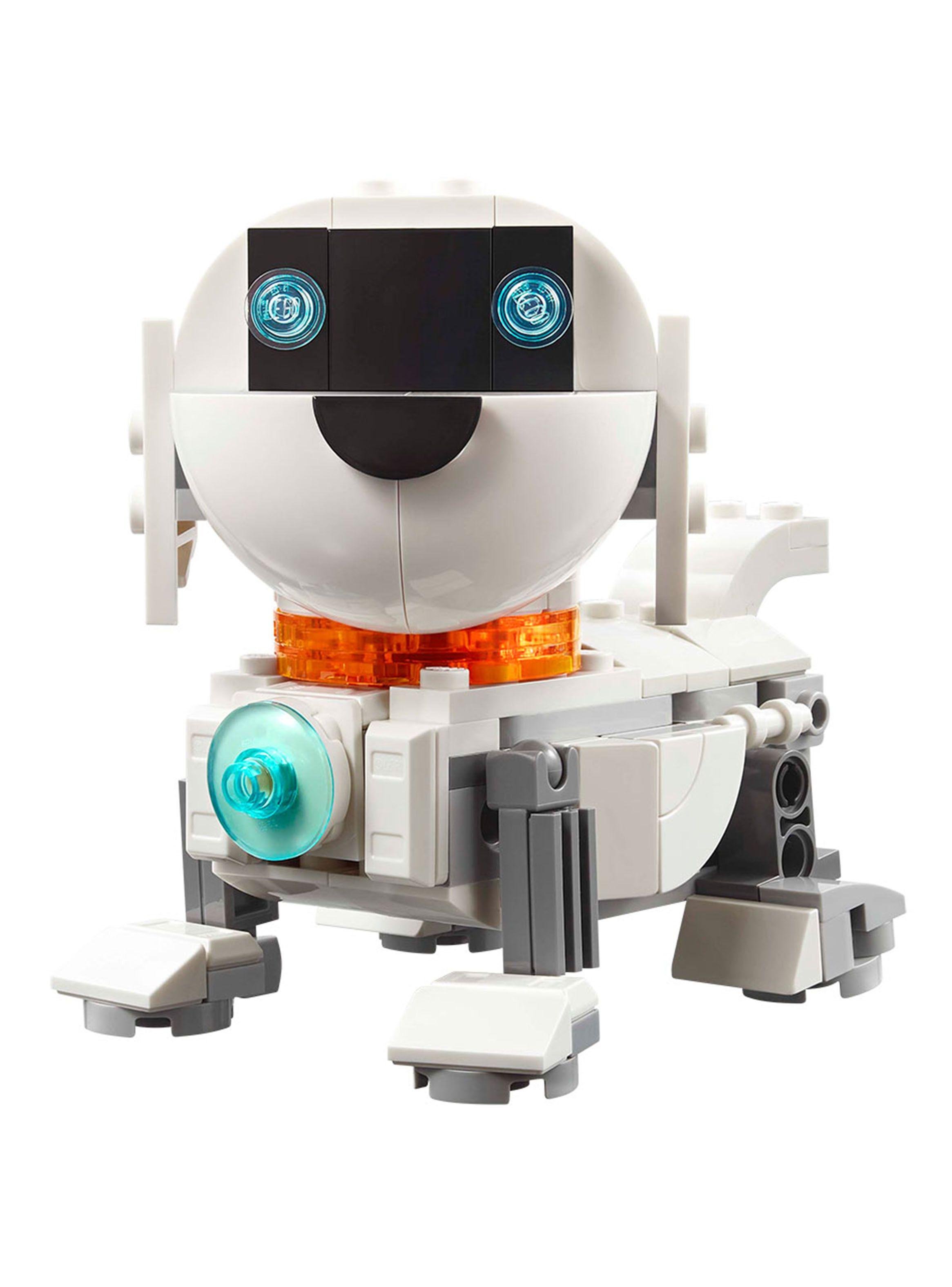 Los fans de LEGO construyen y reconstruyen 3 juegos de tema espacial con los mismos ladrillos: un robot de juguete sobre orugas móviles; un perro espacial articulado con un hueso y un disco volador; o un cohete espacial. Los 3 modelos para jugar y exponer se iluminan al pulsar un ladrillo con luz (pilas incluidas).