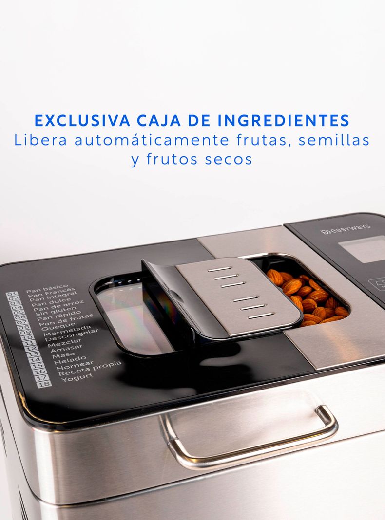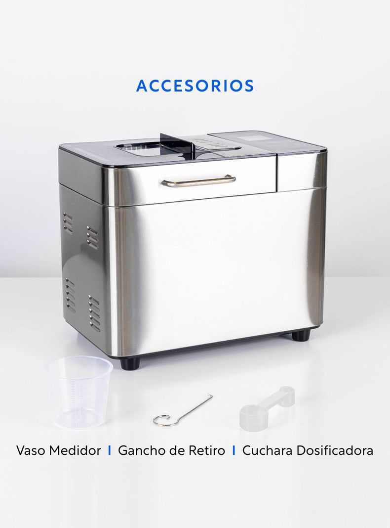 Incluye18 programas 3 tamaños de pan + 3 diferentes opciones de tostado + Botones touch + Pantalla LCD que muestra la programación elegida + Tiempo y avance del proceso + Ventana de visualización para observar la preparación + Bloqueo del panel de control para una cocción segura + Base principal de acero inoxidable + 550 W de potencia + Molde antiadherente
