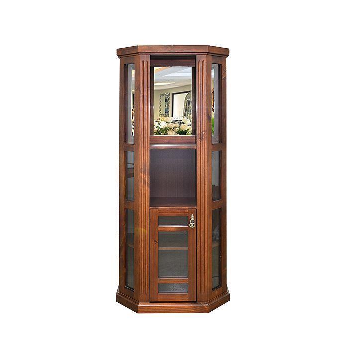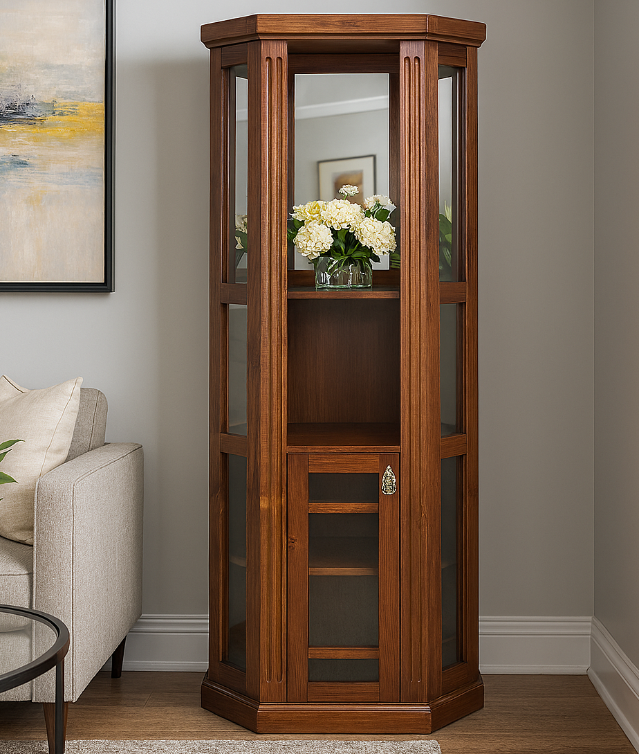 Este diseño se caracteriza por incluir un espacio extra de almacenaje en la parte inferior, sin perder capacidad de exhibición. El cajón permite guardar elementos que no necesitan ser vistos, mientras las puertas ofrecen acceso visual al contenido. Este tipo de vitrina es útil para combinar funcionalidad con estética.