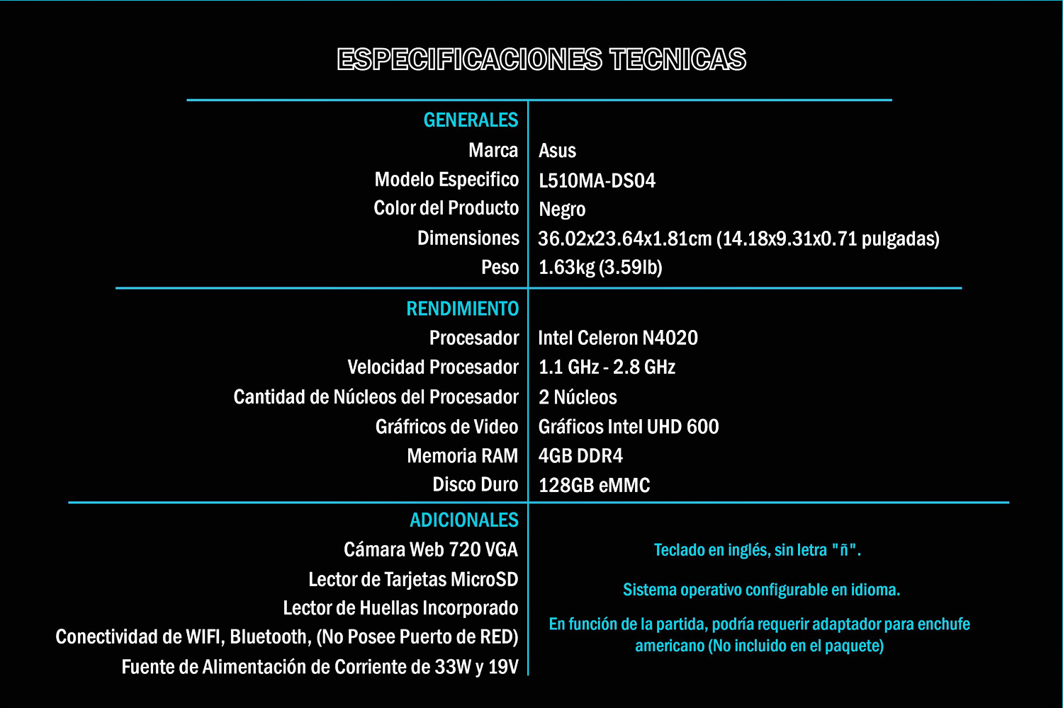 Notebook Asus L510 Intel 4GB 128GB SSD 15.6” FHD W10