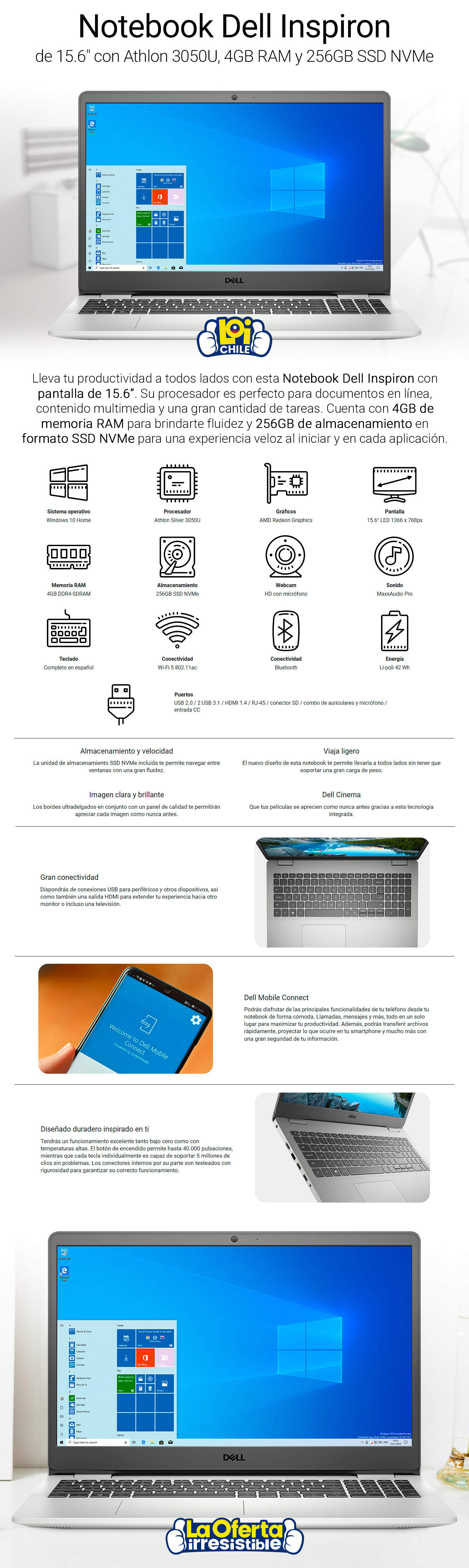 Notebook DELL 15.6' AMD 3050U 256GB SSD 4GB ESPAÑOL WIN 10