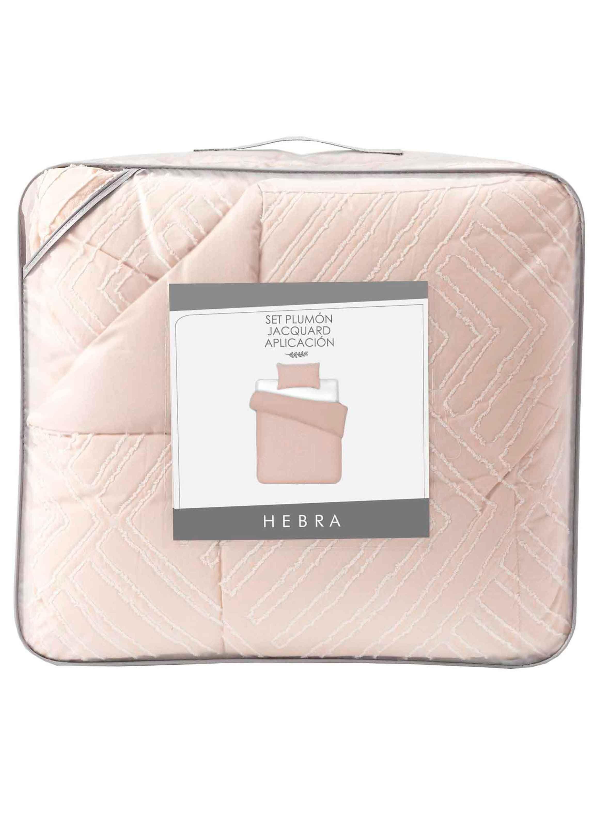 Plumón Jacquard 1.5 Plazas Flechas Beige. Envuelve tu descanso en la calidez y armonía de la naturaleza con el Plumón Jacquard 1.5 Plazas Flechas Beige de la colección Serenity de Hebra. Inspirado en la fluidez del bosque y el equilibrio de los elementos, este plumón destaca por su textura en relieve, lograda a través de aplicaciones que realzan su diseño de líneas en punta de flecha. Confeccionado en jacquard 100% poliéster, su tejido combina elegancia y suavidad, brindando una sensación acogedora y un look sofisticado. Su tonalidad beige es versátil y atemporal, perfecta para crear un ambiente de calma y bienestar en tu dormitorio. Transforma tu dormitorio en un refugio de bienestar con Hebra, donde la suavidad y la armonía natural se encuentran para ofrecerte el mejor descanso. Incluye: 1 Plumón de 175 x 240 cm 1 funda de almohada: 50 x 70 + 10 cm