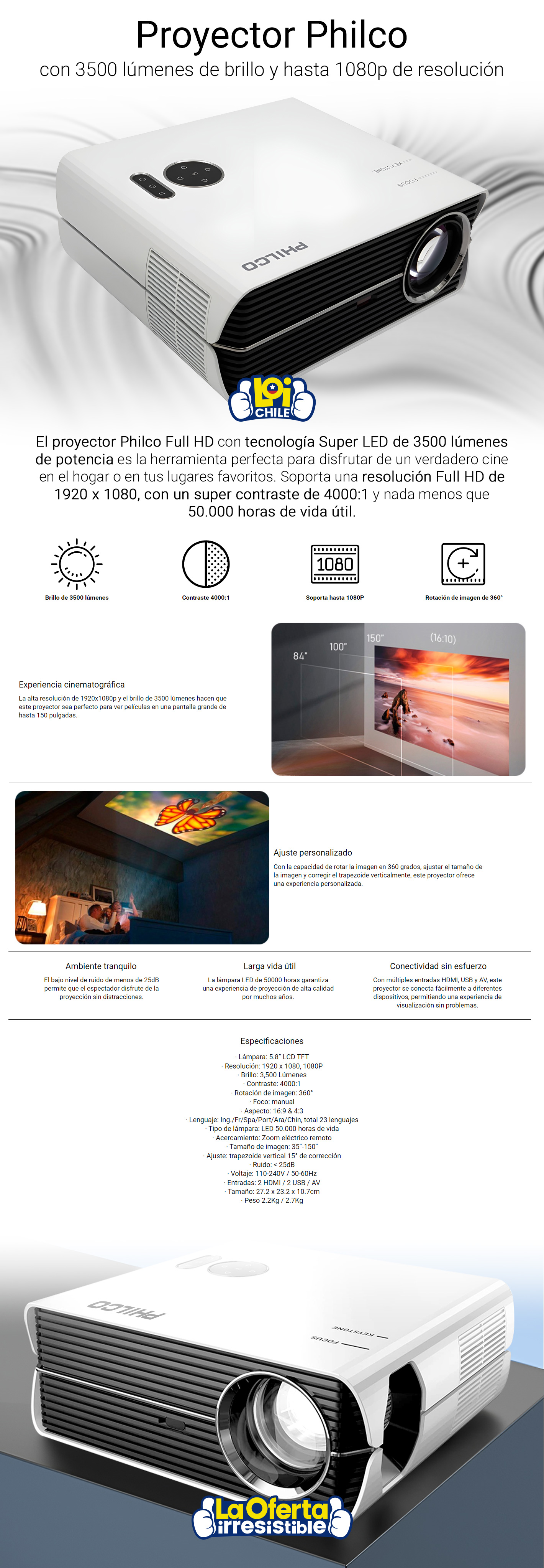 Proyector Led Philco 3500 Lúmenes Full HD 1080P con Control