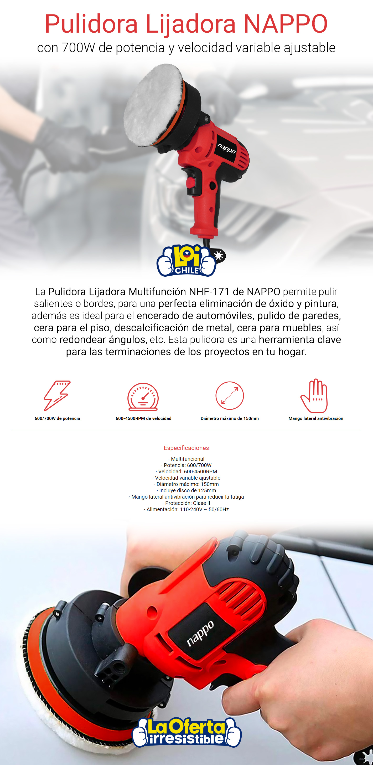 Pulidora Eléctrica Lijadora Multifuncional Nappo 700W