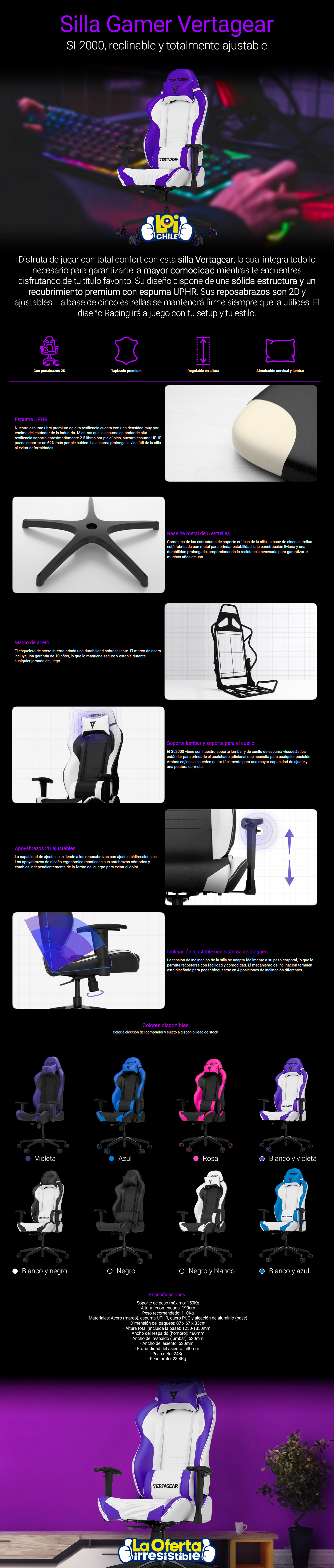 Silla Gamer Vertagear SL2000 Blanca y Violeta Ajustable