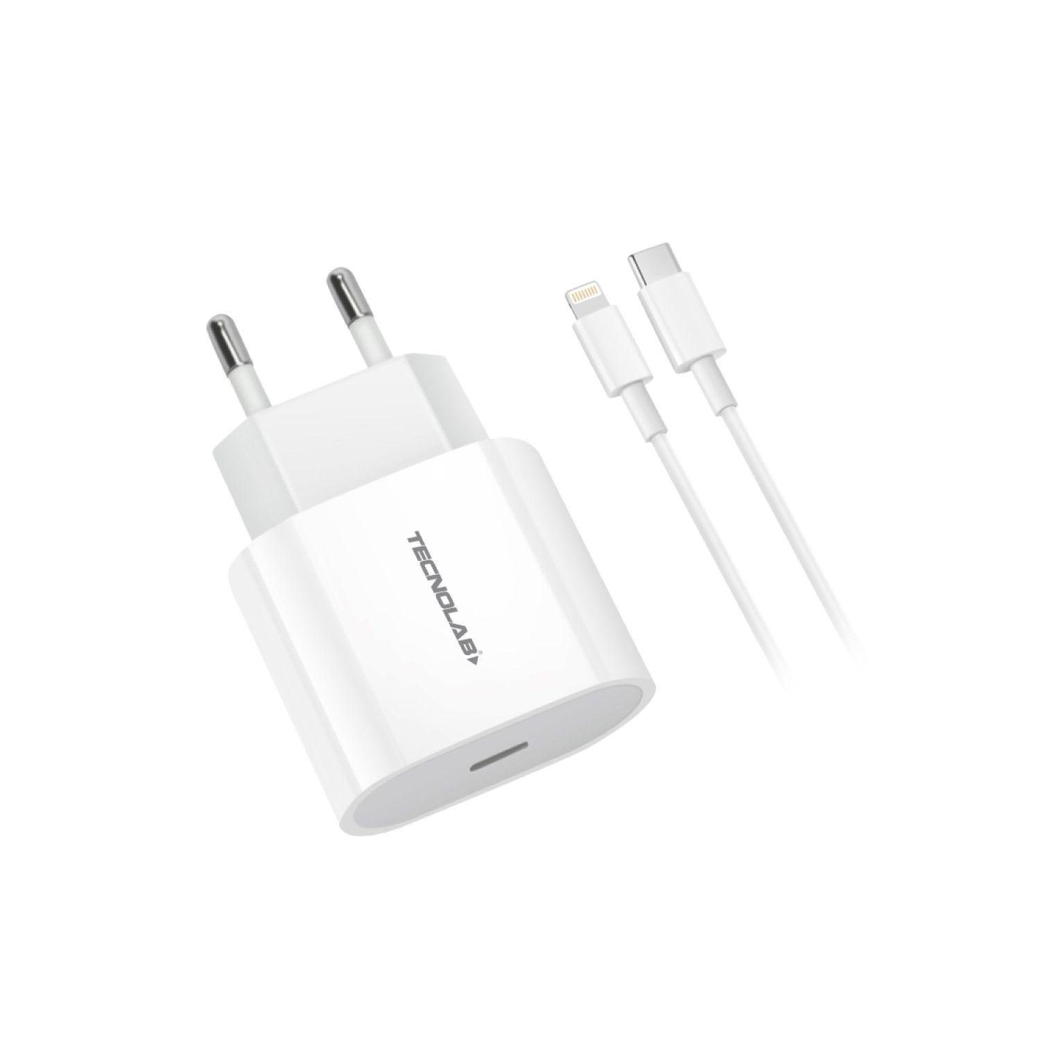 CARGADOR USB TECNOLAB USB CARGA RAPIDA + CABLE TIPO C A LIGHTNING BLANCO