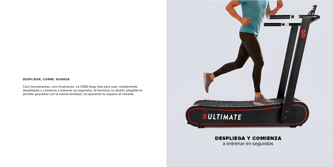 Libera tu verdadero potencial con la Trotadora Curva C350 Fold Plegable, donde tú eres el motor. Su innovador diseño curvo fomenta una técnica de carrera más natural y eficiente, permitiéndote quemar hasta un 30% más de calorías que en una trotadora convencional. Sin consumo eléctrico y con un diseño plegable que no requiere montaje, es la herramienta perfecta para el entrenamiento de alta intensidad. Además, conéctate a Zwift y lleva tus sprints a otro nivel.